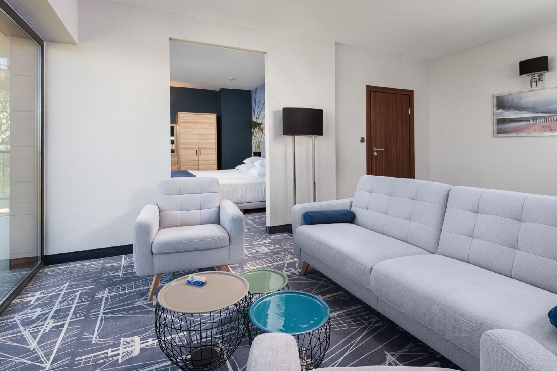 Two-room apartment is located on the first floor. Both the living room and the bedroom offer a view of the Baltic Sea. The apartment features a balcony that allows you to admire the endless expanse of water. It is equipped with two televisions, a refrigerator with a minibar (minibar contents are subject to an additional charge), an iron and ironing board, an electric kettle with a selection of tea and coffee, a telephone, binoculars/telescope, and a safe. The bathroom includes a shower, a set of toiletries, towels, bathrobes, and a hairdryer.Smoking is strictly prohibited throughout the hotel.